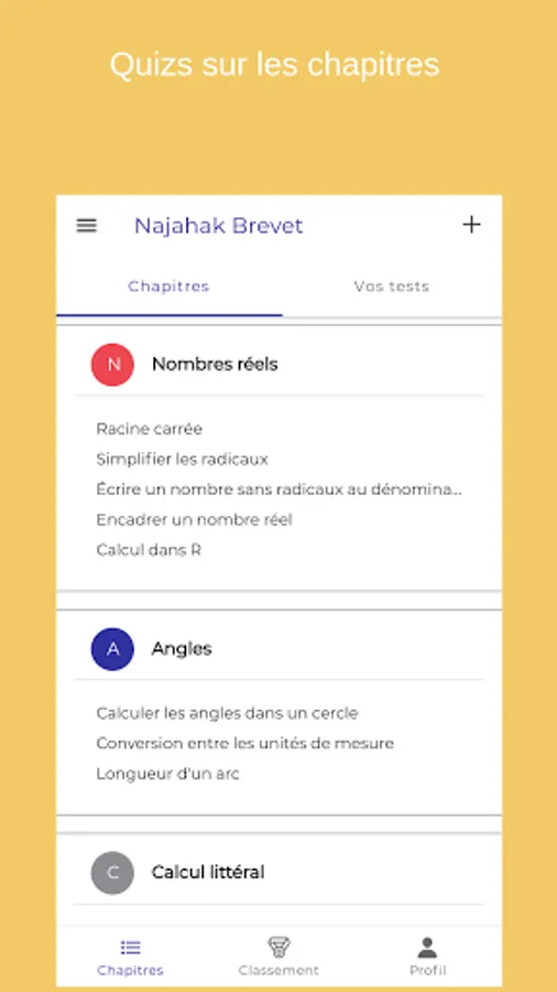 The application "Mathematics to the Patent: Interactive Exercises" provides help to students to improve their level of mathematics with interactive corrected exercises on algebra, geometry, trigonometry and other subjects. Just choose a chapter, the app gives you FREE answer questions, interactive graphics or similar questions to fully understand the concept.