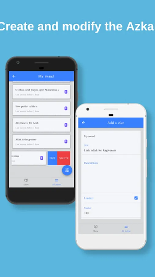 ● Adhkaar management: Adding and modifying the adhkaar whether are limited by number or not and organize them in groups.