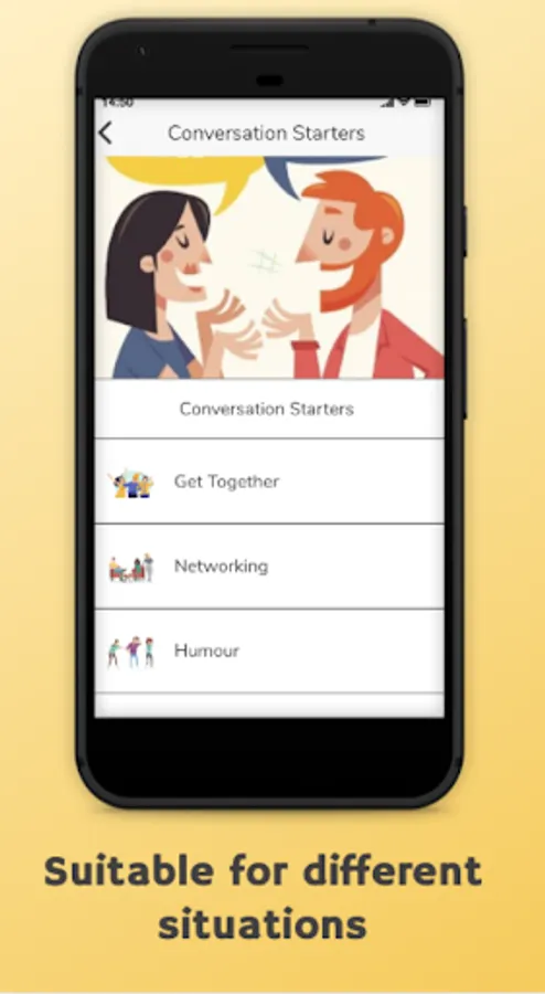 Some of these examples of the Conversations are Translators from different cultures and societies, so you have to know which starters to use in the right time and context. Be it if you are Learning an English Conversation or in a real life situation, have this app in your hand and turn it on whenever you are in need to strike an unexpected conversation.