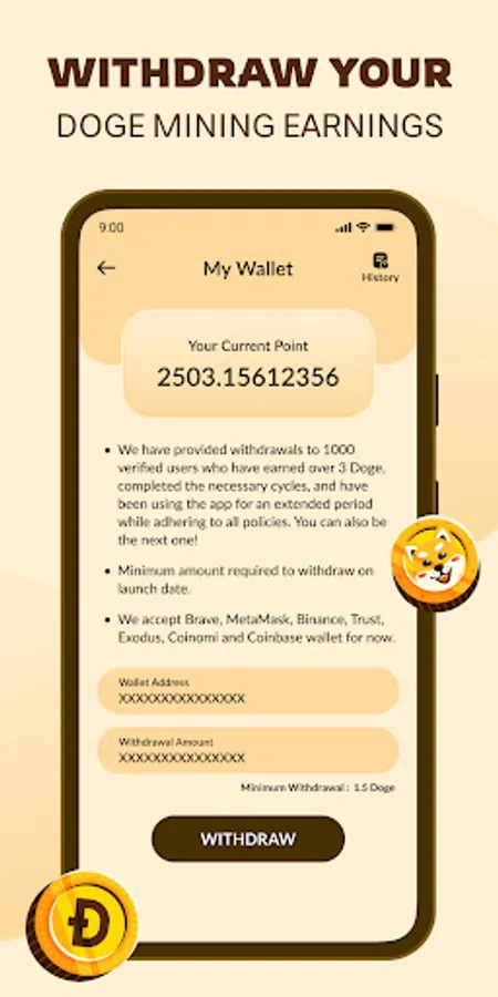 Doge is the latest and new digital cryptocurrency with good future values. We are providing dogecoin mining to mine dogecoin in our cloud server. This app allows you to access and grow your social network by referring friends and earning dogecoin free.