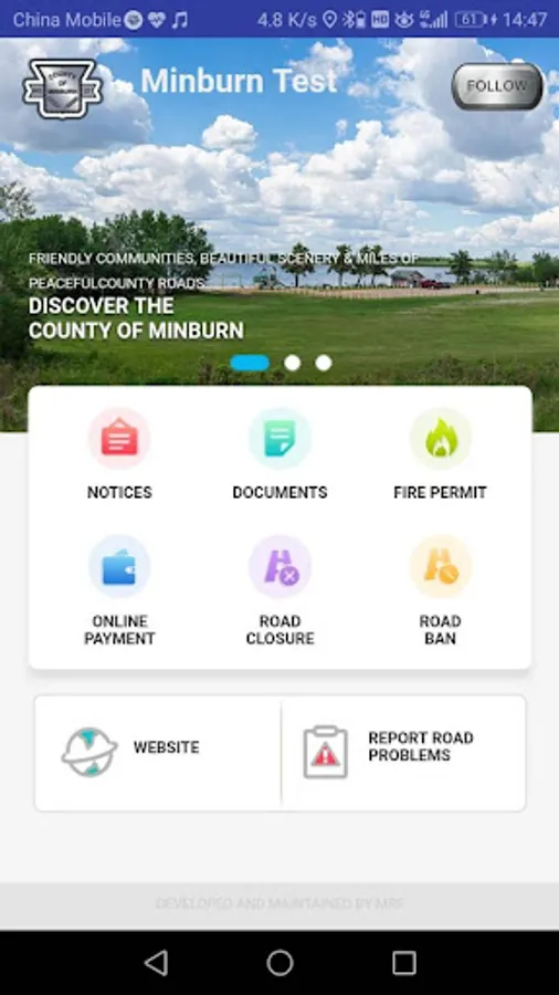The Minburn County app provides County residents with County notices, Council meeting minutes, documents, road closure, road ban and other information. Residents can also report road issues to County through the app.