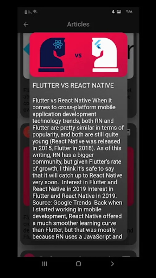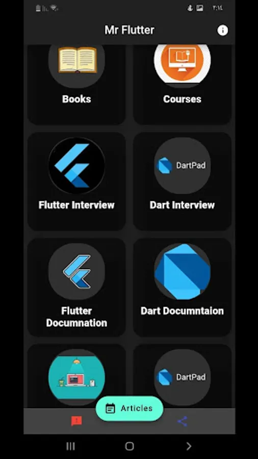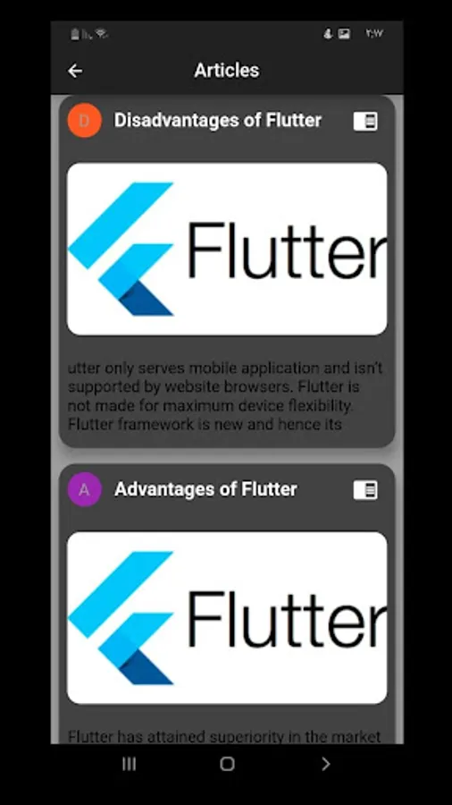 The application also contains the most important common questions about Flutter and Dart and also contains the official explanation from the Flutter site and from the Dart site