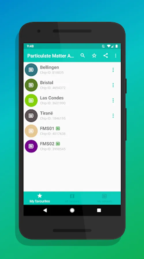 The Particulate Matter App is an application for monitoring of one or several sensors in a network of particulate matter sensors. On the map you can see all sensors worldwide, which are registered in the network. Any number of sensors can be added and monitored. Comparing sensor data is possible too.