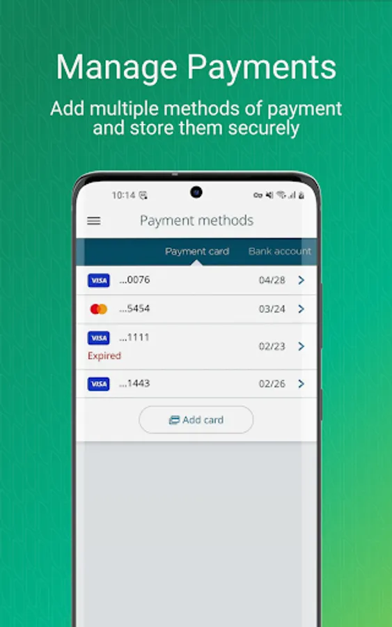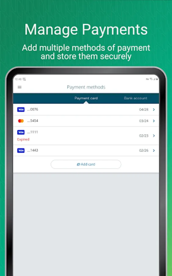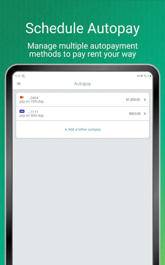 • Payments: Add payment methods and easily pay your rent and property fees