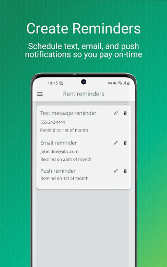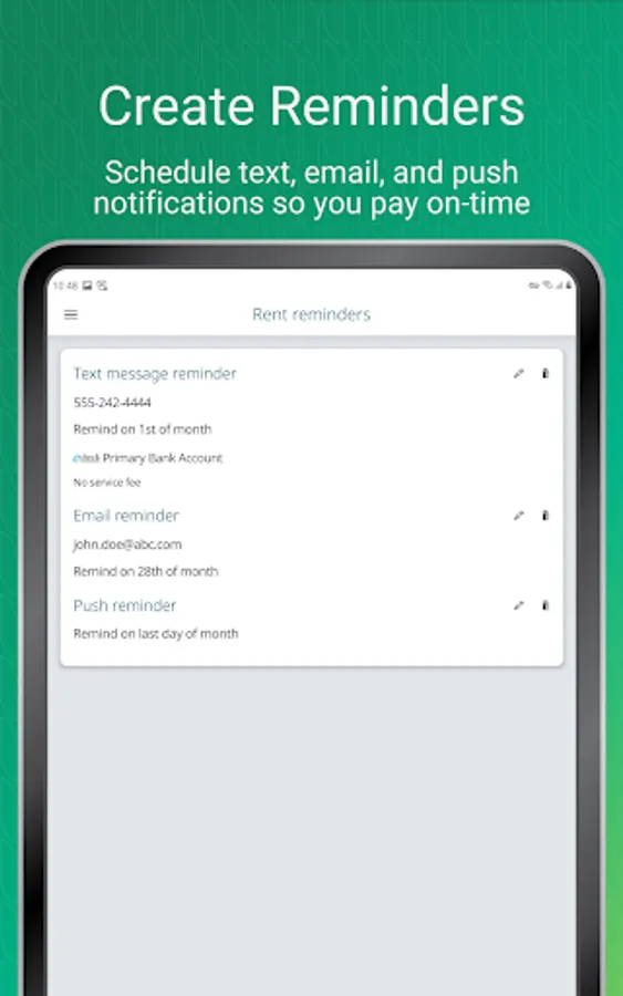 • Reminders: Configure a schedule of push notifications and text and email reminders to help you pay on time