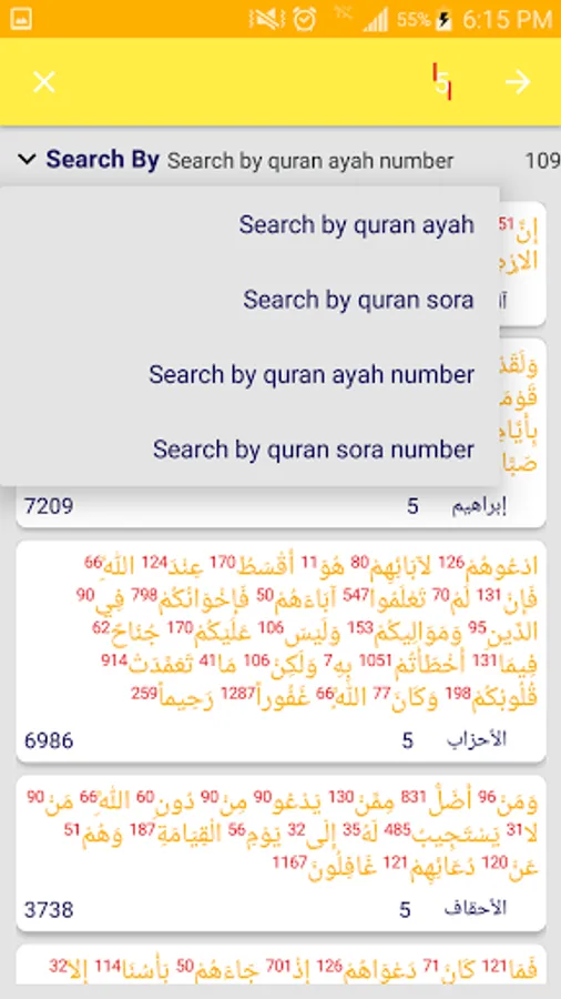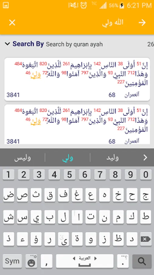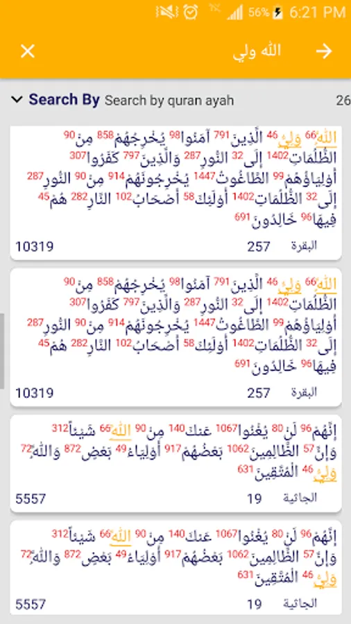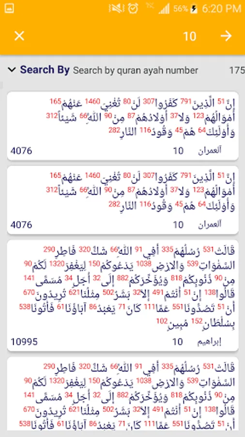 The program calculates the total numbers of letters and words and verses of the surahs of the Qur’an, with the ability to search for verses or suras or surah numbers and verses, and it shows the verses with intonation.