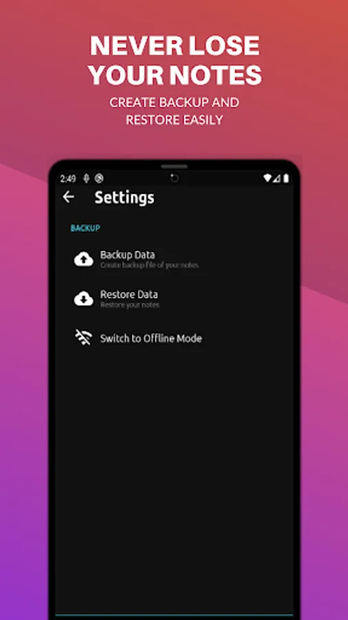 ★ Backup/Restore - Never lose your notes. Create a backup of your data anywhere and restore it whenever you want.