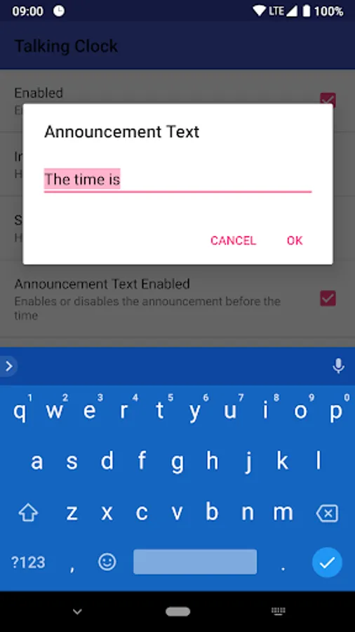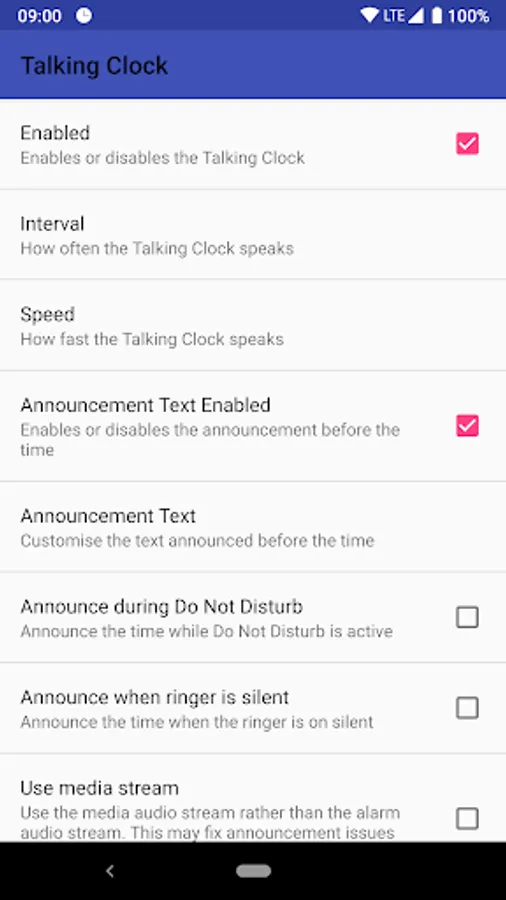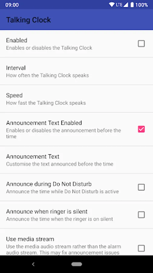 - Uses Android's built in text to speech system to deliver a clear announcement of the time.