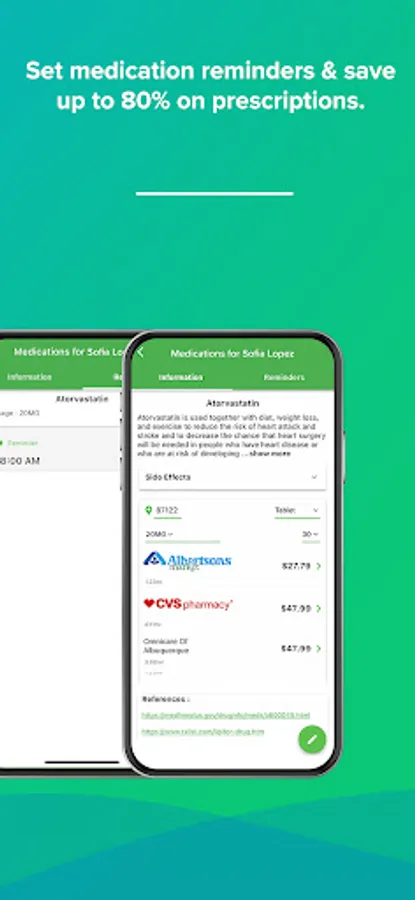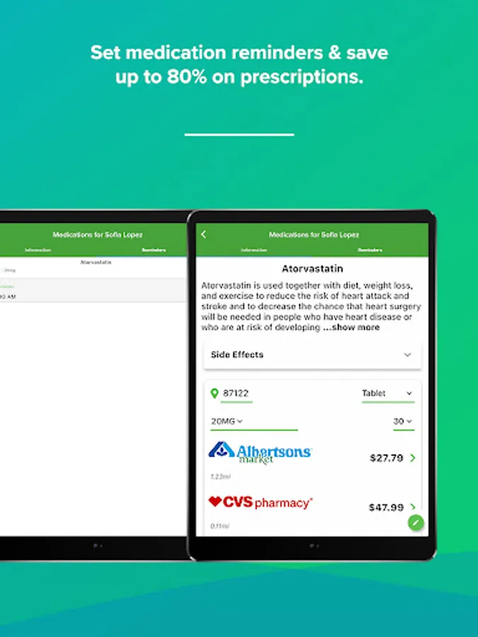 2. A list of your medications, including descriptions, important warnings, and details of their side effects. Plus, the ability to set medication reminders and save up to 80% off of your prescriptions.