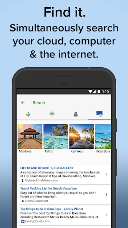 Find it. Simultaneously search your cloud, computer files and the internet together, because they all belong in one search box.