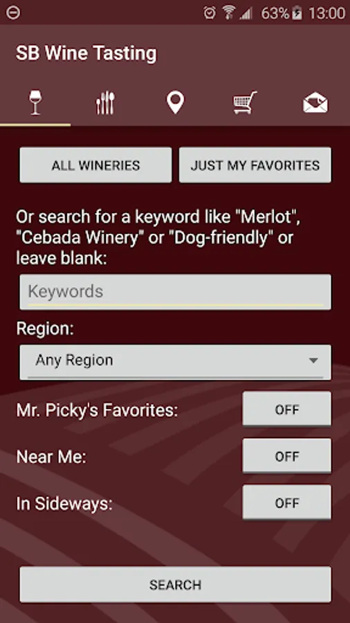 • Three Toggles: “Mr. Picky's Favorites”, “Near Me” and “In the movie Sideways”