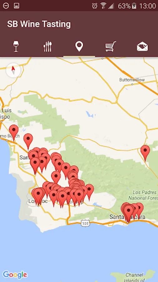 The map page displays pins of every winery in Santa Barbara County. Zoom in, and select a pin to see the winery name and address. Click the popup to navigate to information about that specific winery. When a pin is selected, you can also click on the directions button to get directions to the winery.