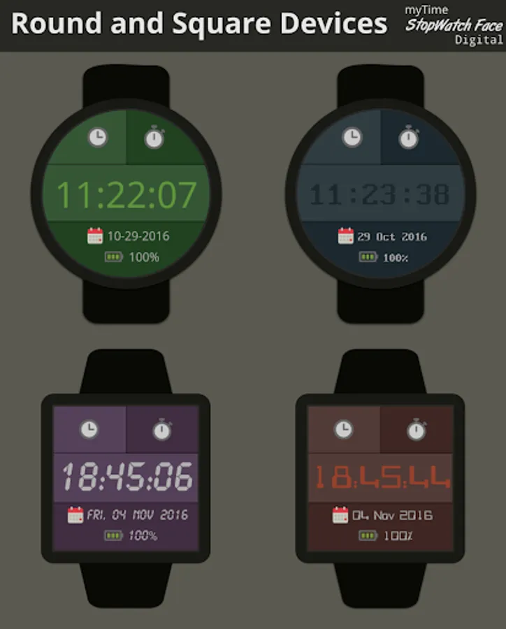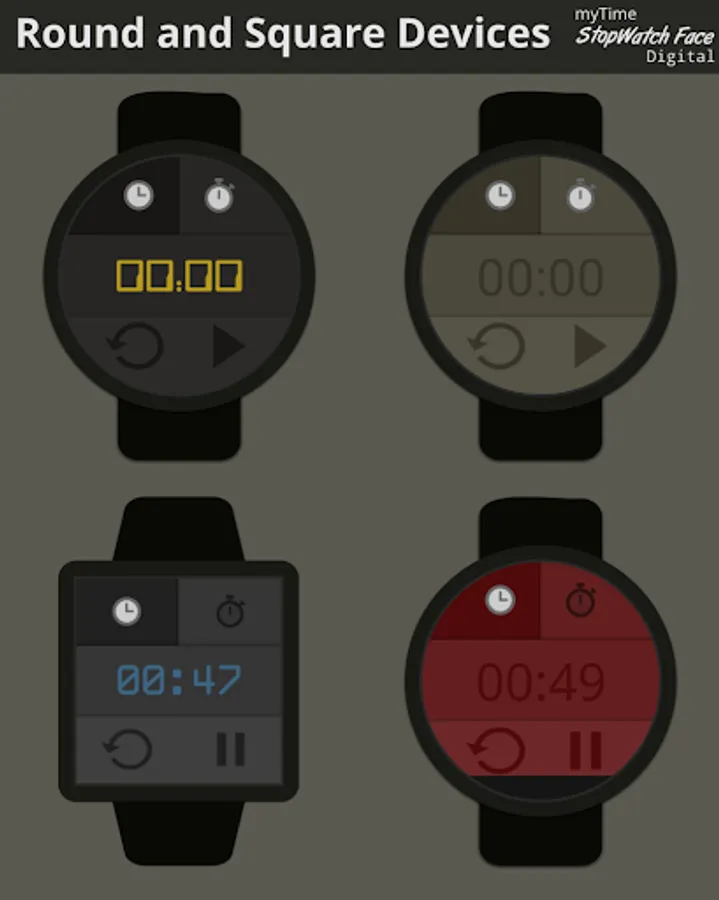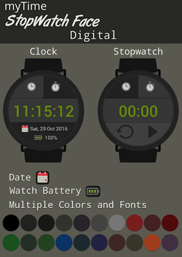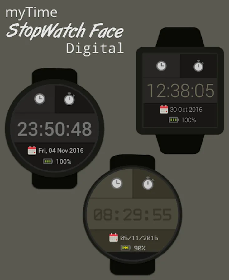 myTime StopWatch Face Digital is a simple, clean and fast standalone watch face with stopwatch function included.