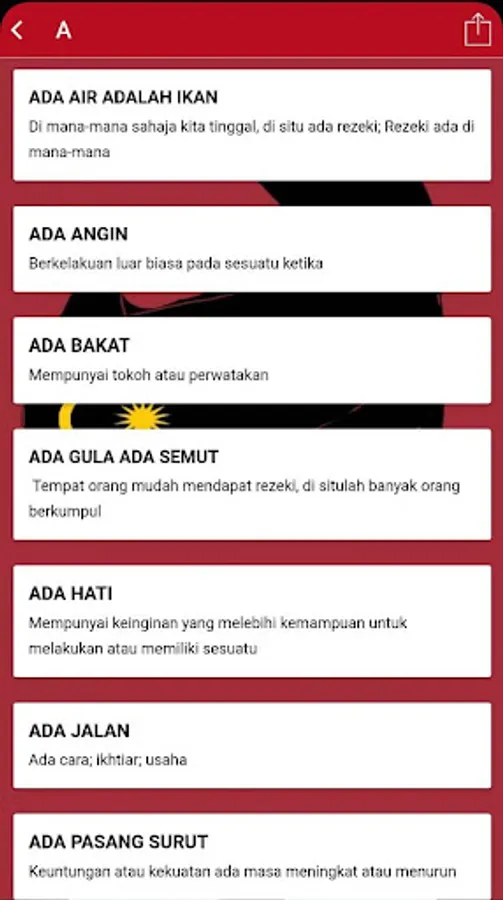 This application is simple and easy to use because the user only needs to select a category based on the beginning of the letter in front of each proverb provided in the application and tap to read the proverb and identify the meaning.