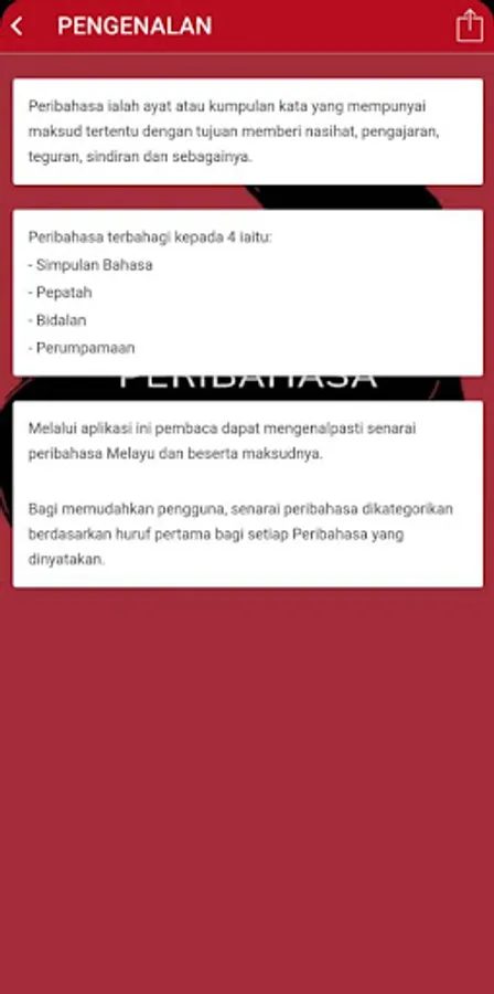 This Peribahasa Melayu Digital application is designed for educational purposes. This will help others to learn and gain knowledge about Malay Proverbs by reading the Proverbs listed. In addition, this application is also suitable for all ages who want to know and learn about Malay Proverbs.