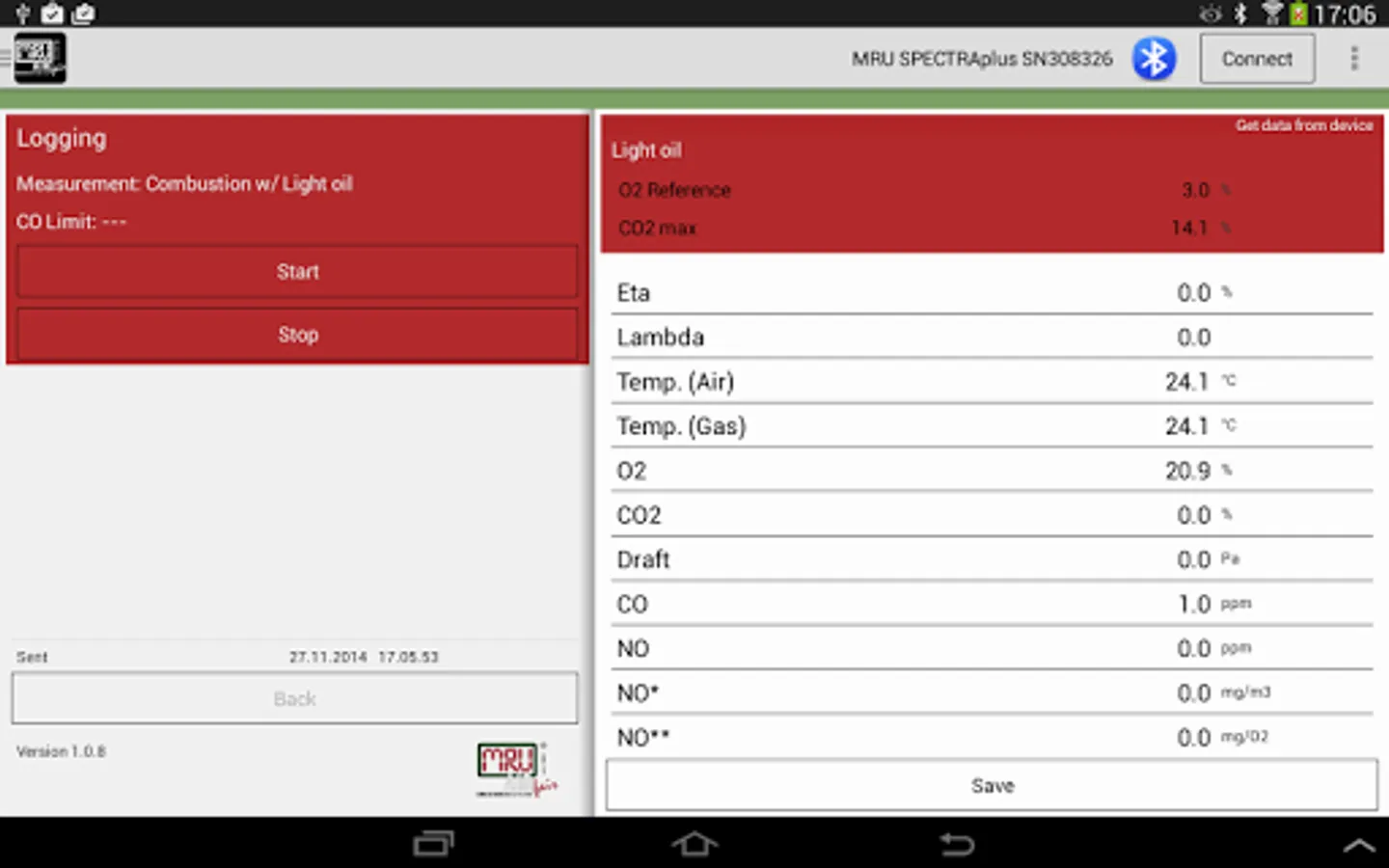 Emission Testers from the company MRU GmbH can be controlled and read out with this application via Bluetooth. The devices must be in the "Main Menu" to start and stop the measurements with this app.