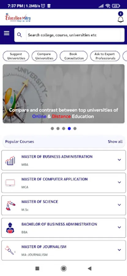 Education Mitra is the dedicated advanced user-friendly search engine platform that provides a comprehensive database of various Open and Distance Learning/ Online Learning Undergraduate/Postgraduate programs, free online guidance, and counselling sessions (one to one live), and all the information regarding all the Higher Education Institutions which are entitled to start Online /Distance programs from UGC. We help students to figure out the best University for their careers by comparing different universities with one another in terms of affordability, employability, academic reputation, etc.
