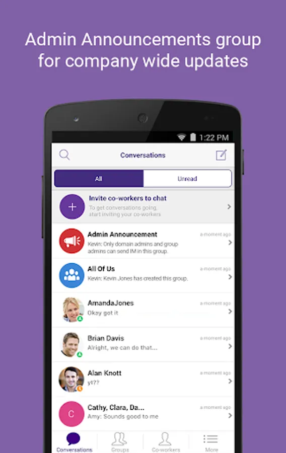 As Office Chat works for private one-to-one conversations or group chats between large or small teams, so you can talk with just one colleague or a group of ten about work related ideas, projects, and more. Beyond chatting, with Office Chat you can also securely share text messages, files, pictures, audio, and videos with your coworkers instantly -- without worrying about exchanging phone numbers or information leaking. Office Chat is the perfect tool for anyone seeking to improve their company's ability to collaborate, network, and share information. It is a cross-platform IM service that you can enjoy on iPhone, iPad, Android, Mac, & Windows Desktop. Start-ups, non-profit organizations, and businesses big and small use Office Chat to streamline information sharing and collaboration within their company. You can use it to improve your business's ability to communicate too! Download the app for free now!