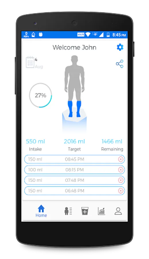 Here we set water intake target using standard algorithm of water intake bases on your body weight, age and lifestyle. Revs up metabolism and helps you feel full.