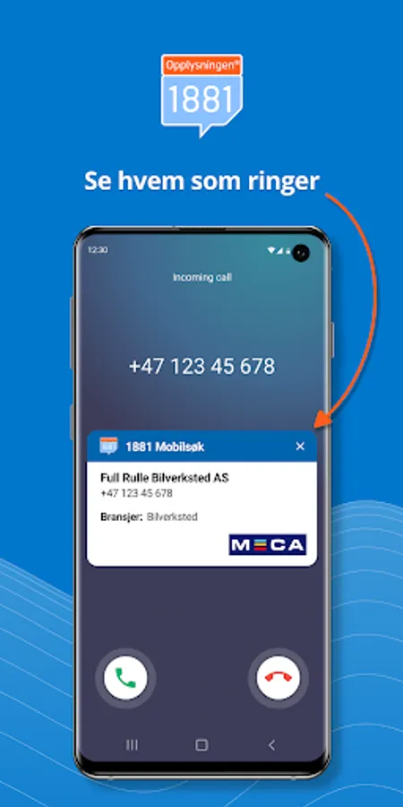 The app shows the name if you call a number that is not in the contact list, i.e. auto search for outgoing calls. All searches from 1881 Mobilsøk go against Opplysningen 1881's database, which ensures high quality. NOTE: Use of the 1881 Mobilsøk apps requires a subscription (NOK 49 per month, first month free), or a business agreement with Opplysningen 1881. Read more on our website.