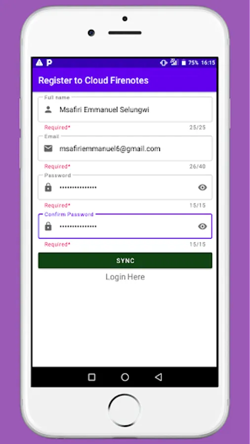 ------------------------------------------------------------------------------------------------------------------------->personal information required to use this app such as name, email and password.