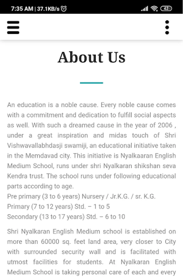 An education is a noble cause. Every noble cause comes with a commitment and dedication to fulfill social aspects as well. With such a dreamed cause in the year of 2006 , under a great inspiration and midas touch of Shri Vishwavallabhdasji swamiji, an educational initiative taken in the Memdavad city. This initiative is Nyalkaaran English Medium School, runs under shri Nyalkaran shikshan seva Kendra trust. The school runs under following educational parts according to age.