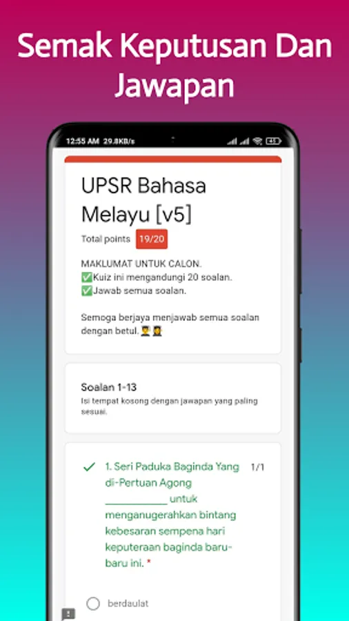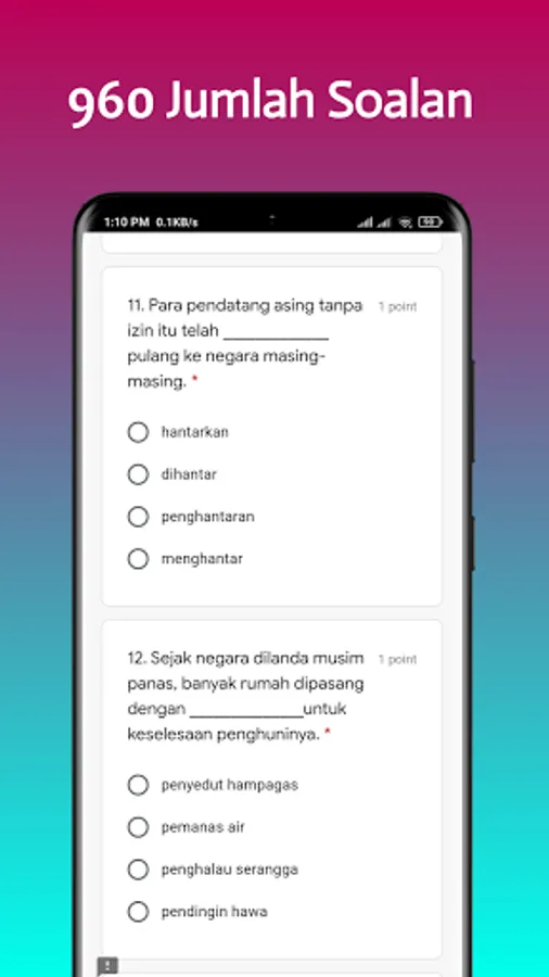 This application can enable students to practice answering questions anywhere and at any time via smartphone online. After answering the questions, the candidate can check the answers and the marks obtained. It is hoped that this application can help students get excellent results in the real exam.
