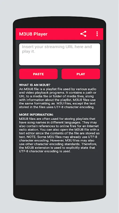 M3U8 player is a simple video player application that can play any valid online video url. It is capable of playing m3u8, mp4, hls and many more supported video links from internet.