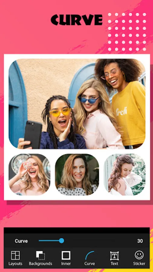 β Mixing multiple photos with customized photo grid size, border color, curve of border and gradient backgrounds.