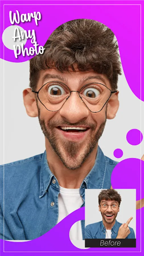 Face Warp - Face Changer is the best app for face morph. You can make your photo funny, crazy and more creative with this funny photo editor. You can make your face slim and fatty and show your creativity to your family and friends. Make yourself skinnier, enlarge any body parts that might need some enlargement. Make your photo more exciting, creative, funniest with this funny photo editor. Face Warp app allows you to stretch any body part like ear, nose, eyes etc to make your photo funny. If you like creativity then you will love this app. Make a joke with your friend's photo and send them to this morphing pic.