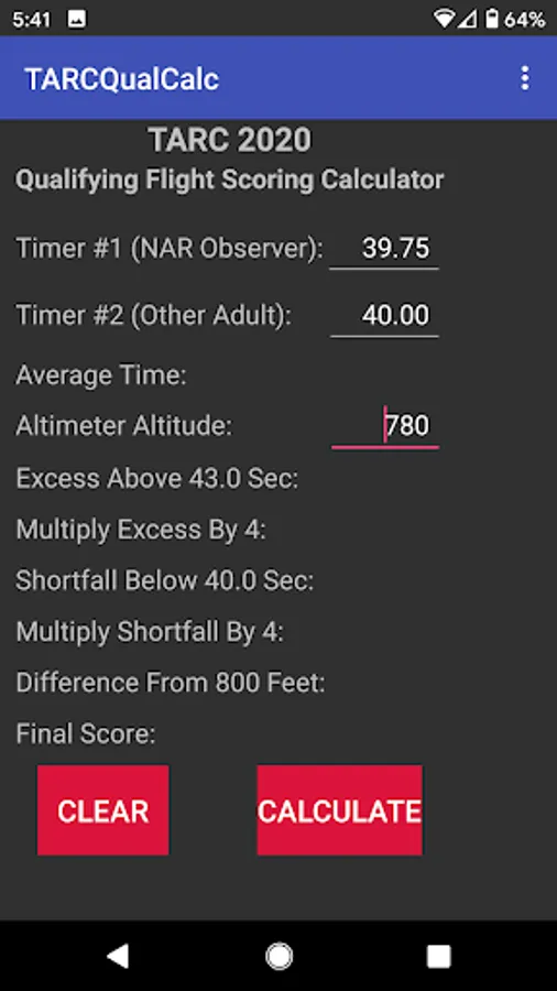 Given inputs for Timer #1, Timer #2 and Altimeter Altitude, per the TARC rules, TARCQualCalc will calculate: 1) average time of the flight (rounded to .01 seconds); 2) excess/shortfall time and associated score; 3) absolute value of the difference between the altimeter and target altitude; and 4) final score. The computed values can then be copied directly onto the TARC Qualification Flight form.