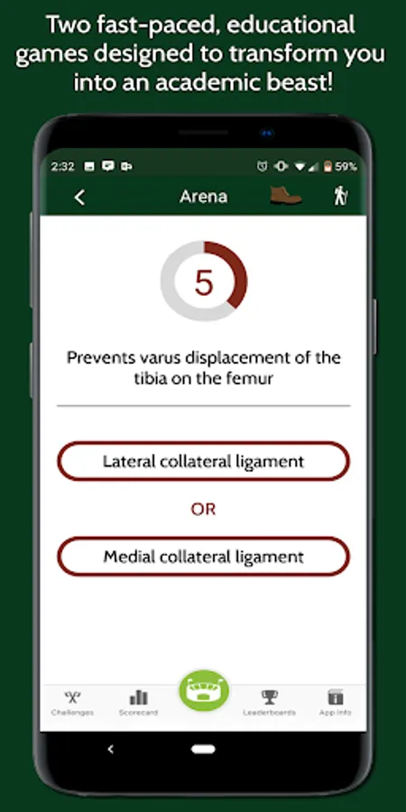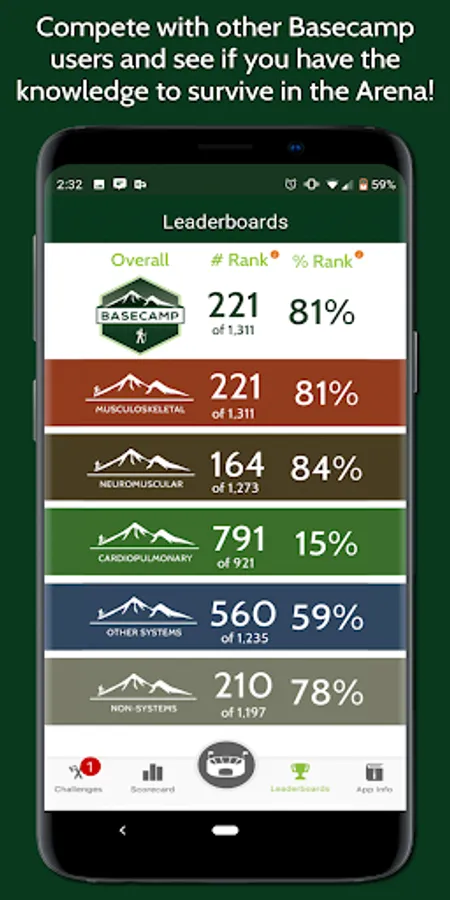 The Arena app allows current Basecamp users to utilize our competitive games King of the Mountain and Climb, anytime and anywhere. Play the games in solo mode or challenge a classmate to a battle of wits. Collectively, the two game modes offer over 5,000 questions designed to assist students to commit critical core academic content to long-term memory. The questions are presented in five unique Mountains (i.e., Musculoskeletal, Neuromuscular, Cardiopulmonary, Other Systems, Non-Systems). The games add a competitive aspect to studying and fully engage students as they learn. See how you stack up to the competition! Students can explore their performance data using the Arena – Scorecard and Leaderboard. Summative data collected in the Arena can be used to direct future remedial efforts. Lace up those hiking boots and let the games begin!