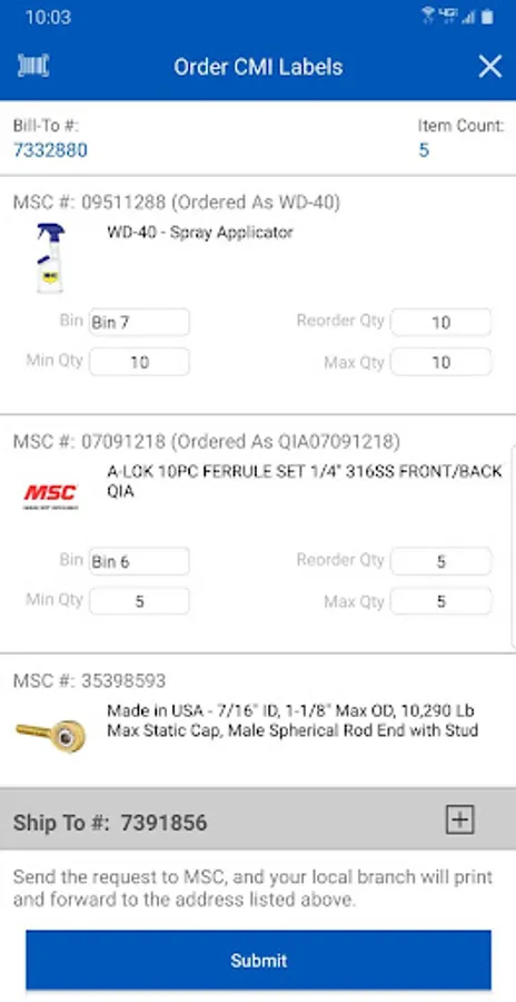 The ControlPoint app powered by MSC, is designed to make maintaining stocking levels and order replenishment quicker and easier. Use the app to cut costs and get better control over your inventory by placing orders on-the-go right from your mobile device without having to log into mscdirect.com.
