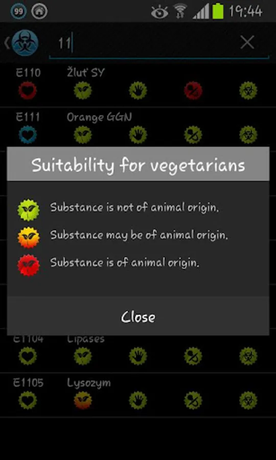 • Application searches E Numbers/Food Additives and displays their basic properties (harmfulness, suitable for vegetarians, suitable for sensitive persons, suitability for children, the source of the substance was / was not genetically modified)