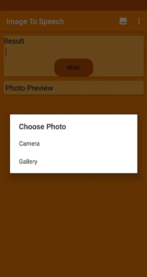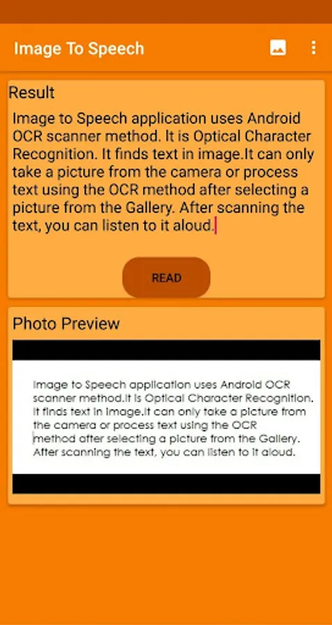 Image to Speech application uses Android OCR scanner method.It is Optical Character Recognition.It finds text in image. It can only take a picture from the camera or process text using the OCR method after selecting a picture from the Gallery. After scanning the text, you can listen to it aloud.