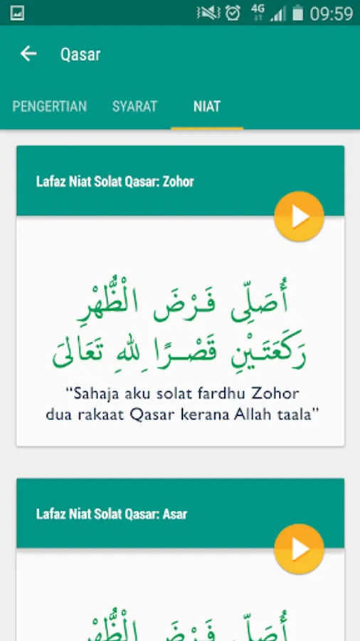 - Audio disertakan untuk membolehkan pengguna untuk mendengar lafaz niat solat agar lebih jelas