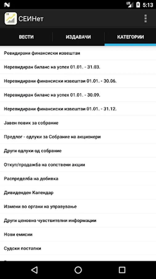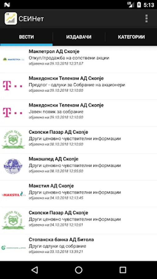 SEI-NET e posebna mobilna aplikacija na Berzata na koja se objavuvaat izvestuvanjata od kotiranite drustva soglasno Pravilata za kotacija. Izdavacot gi objavuva site cenovno cuvstvitelni informacii preku internet aplikacijata za izvestuvanja od strana na kotiranite drustva SEI-NET. Izvestuvanjata objaveni na SEI-NET berzata gi pravi dostapni za javnosta.