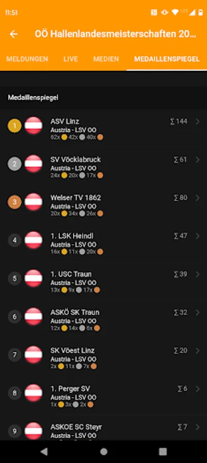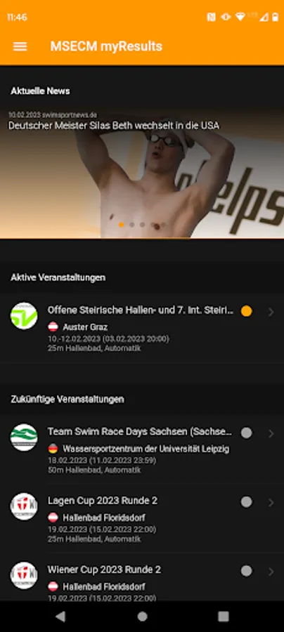 - Shows upcoming and past meets which are available on the myResults and CIS-Online platform