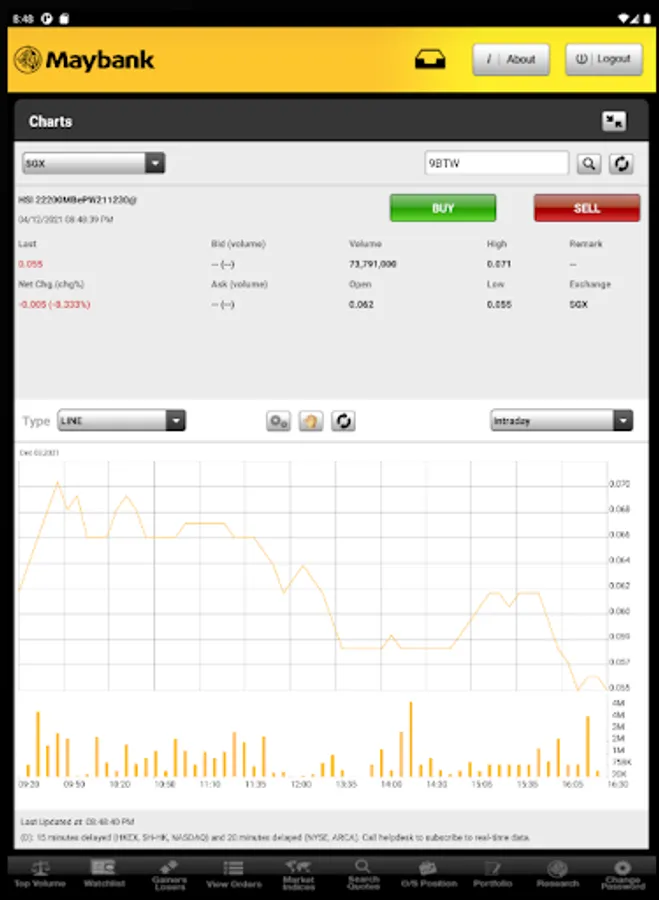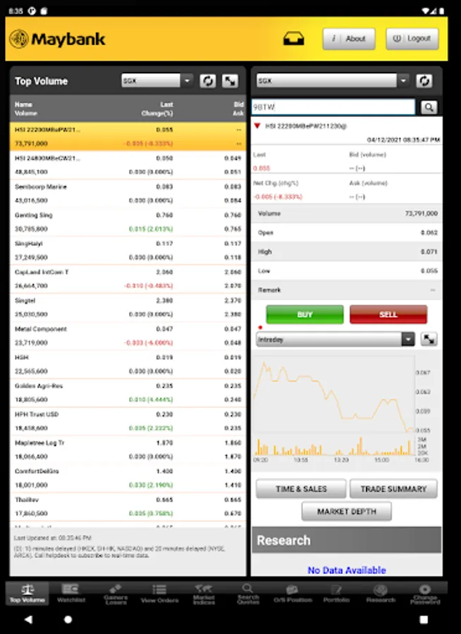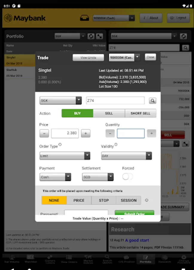 Seize investment opportunities while you are on the move with Maybank Securities Maybank Trade Mobile Android Tablet app Trade in local and foreign markets including Singapore, Hong Kong, Shanghai (‘A’ shares), US, Malaysia and Thailand – anytime, anywhere. In addition, make informed trading decisions with the help of our research and other trading tools.