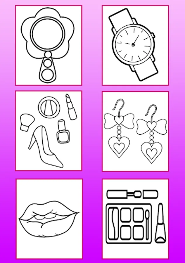 ✔ 65 coloring pictures of makeup, rings, clothes, wallets, bags and other accessories.