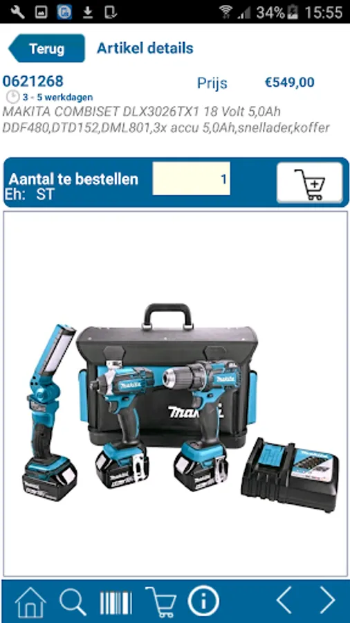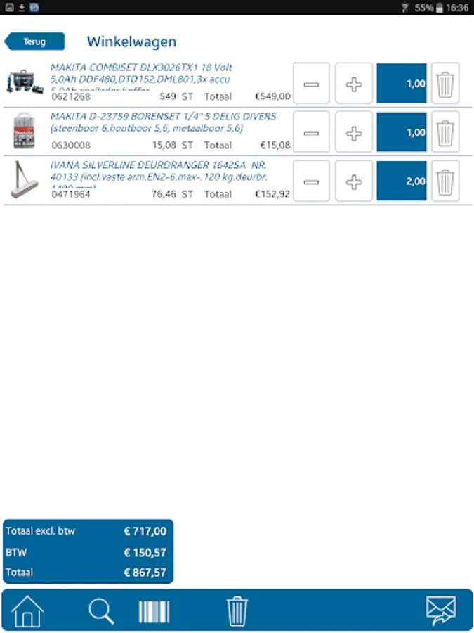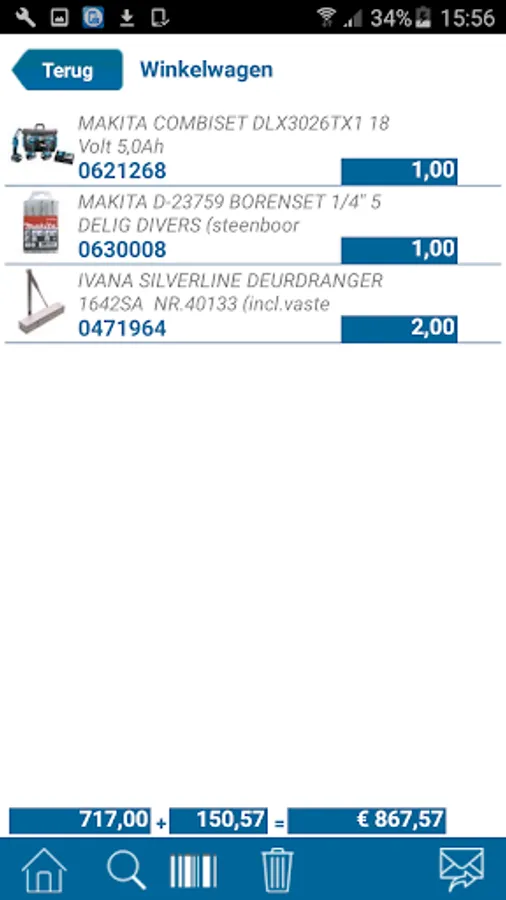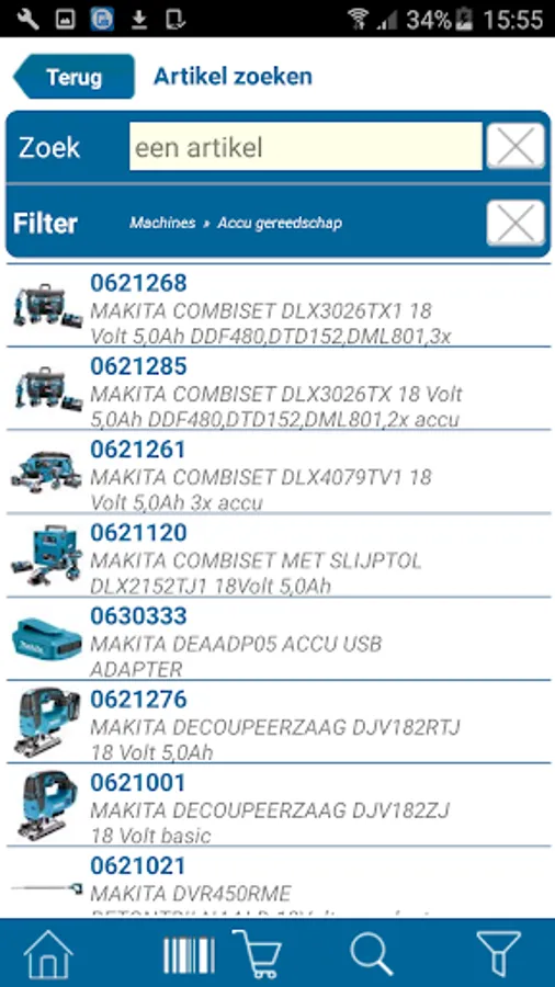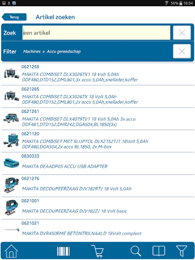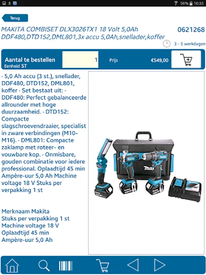 Items can be easily searched by item number, (part of) a determination or via a filter in the search menu. Also, there can be searched for by means of scanning a barcode. Further items from shopping lists or have already placed orders are added to the cart.