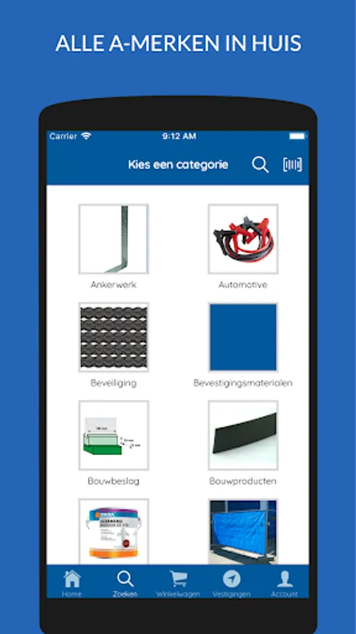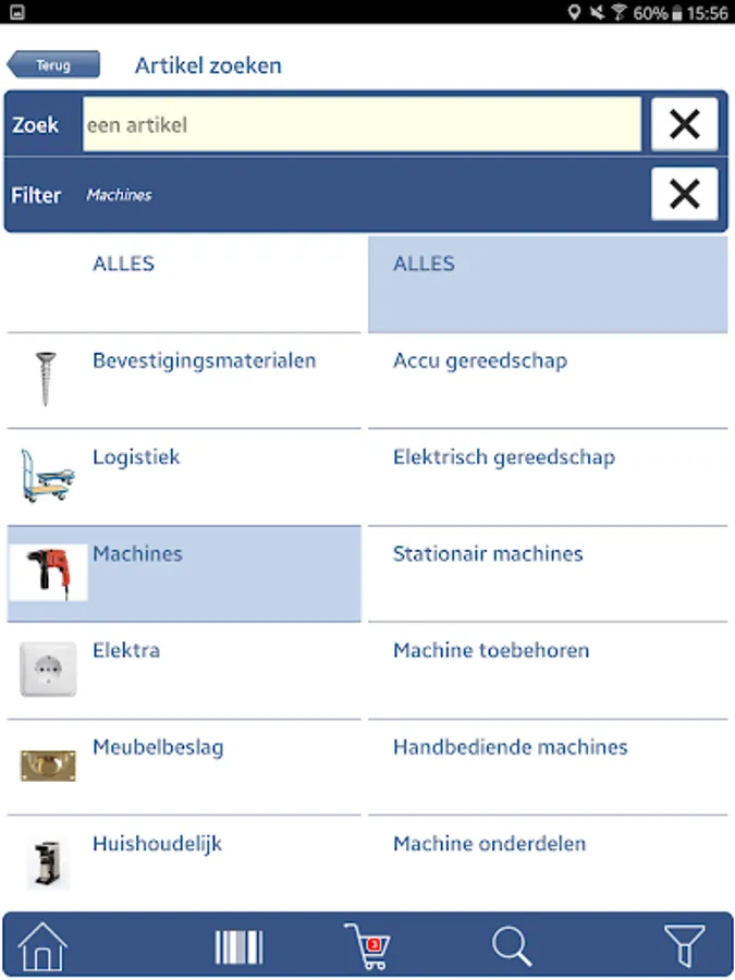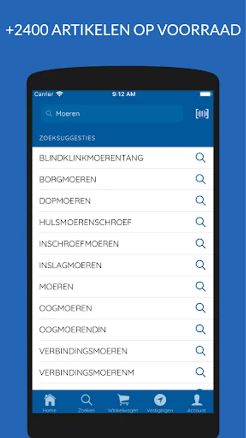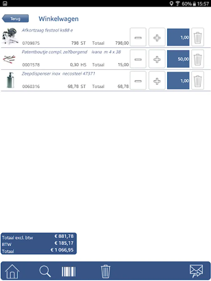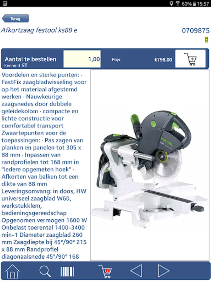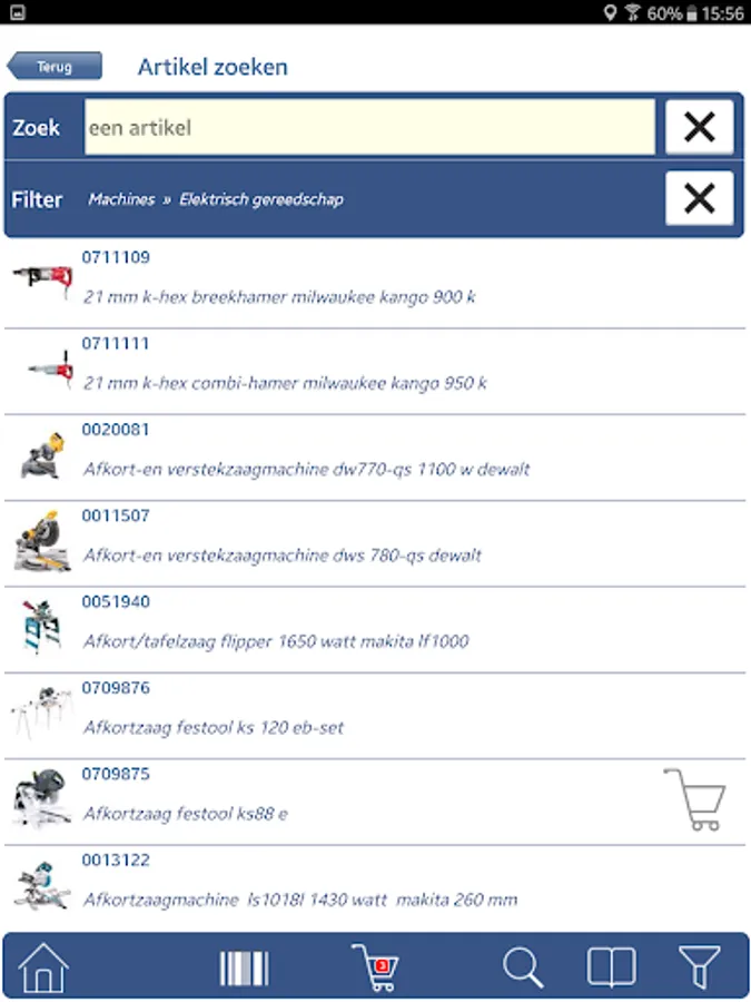 Items can be easily searched by item number, (part of) a determination or via a filter in the search menu. Also, there can be searched for by means of scanning a barcode. Further items from shopping lists or have already placed orders are added to the cart.