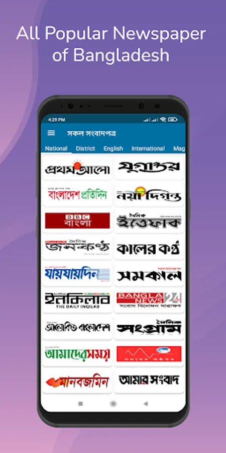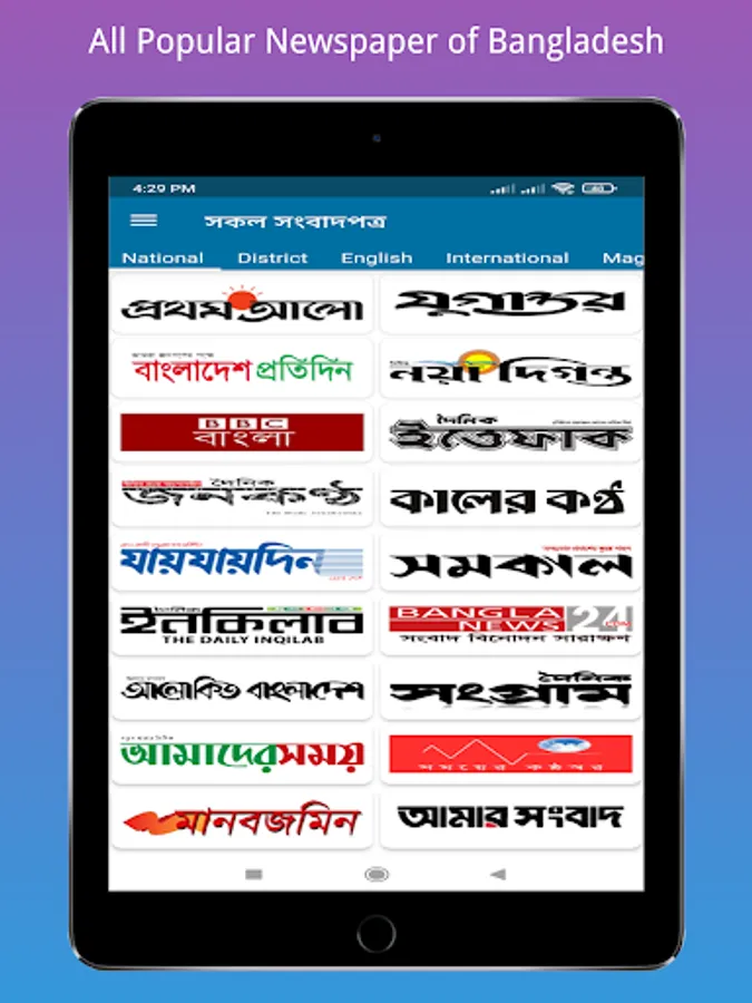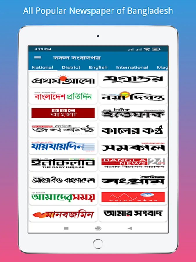 This app contains all Bangladeshi National Newspapers, District Newspapers, English Newspapers and international Newspapers. You can read all Bangla newspapers, District Newspapers, Bangladeshi TV News, Bangladeshi English Newspapers, Bangla Magazine news, Educational News and World Newspapers from this app and also Bangladeshi online news portal.