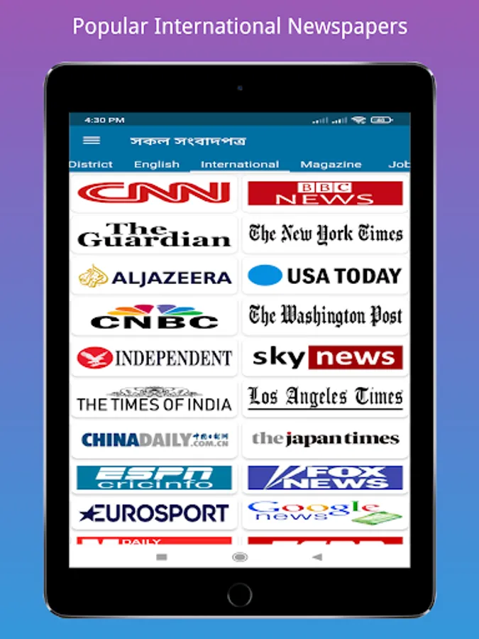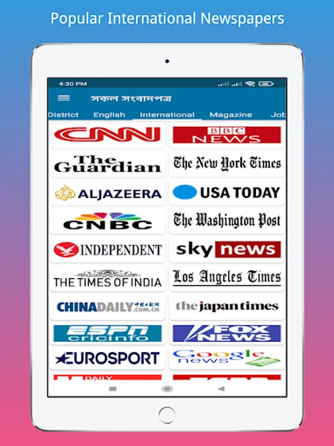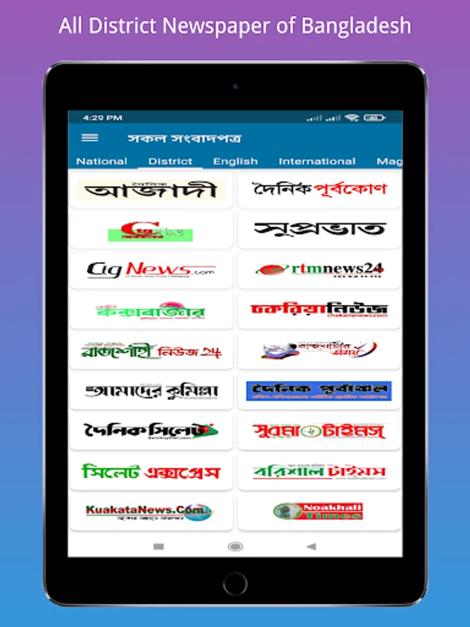 তাই প্রতিটি বাংলা সংবাদপত্রের জন্য আপনার আলাদা নিউজ অ্যাপের প্রয়োজন নেই আপনি শুধু এই অ্যাপটি সমস্ত বাংলাদেশী বাংলা সংবাদপত্রের জন্য ইনস্টল করতে পারেন। এই অ্যাপে বাংলাদেশের সকল বাংলা সংবাদপত্র, জেলা সংবাদপত্র এবং ইংরেজি সংবাদপত্র অন্তর্ভুক্ত করা হয়েছে