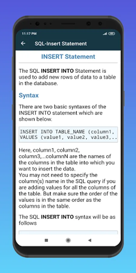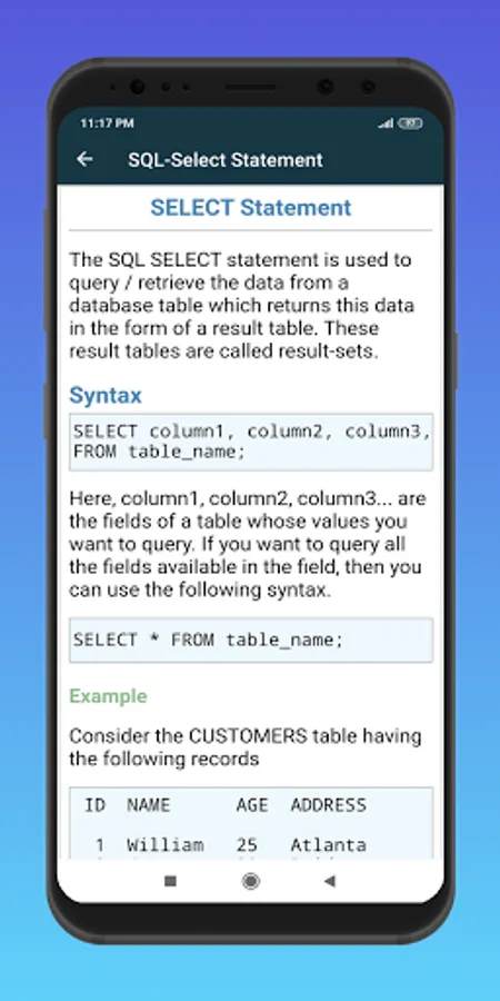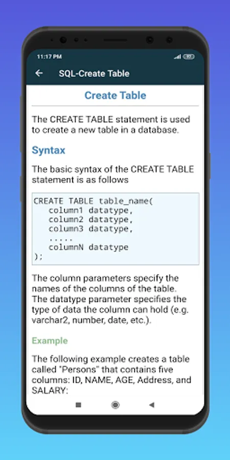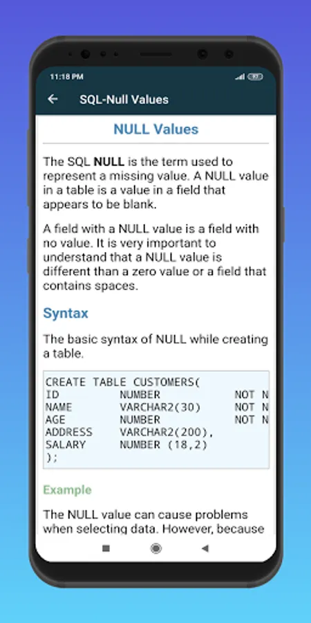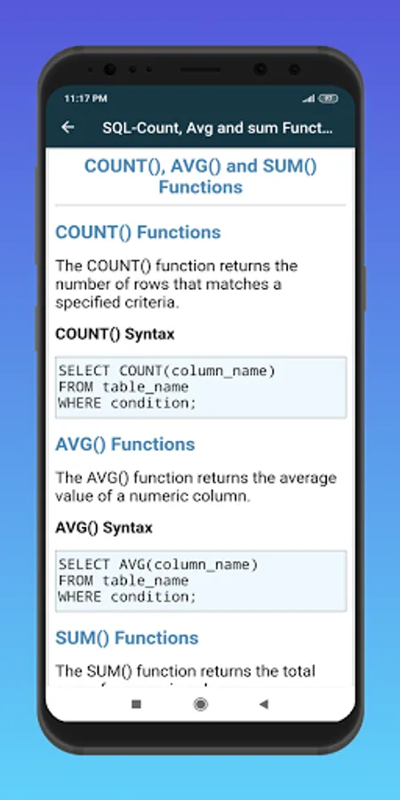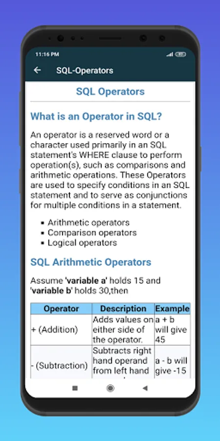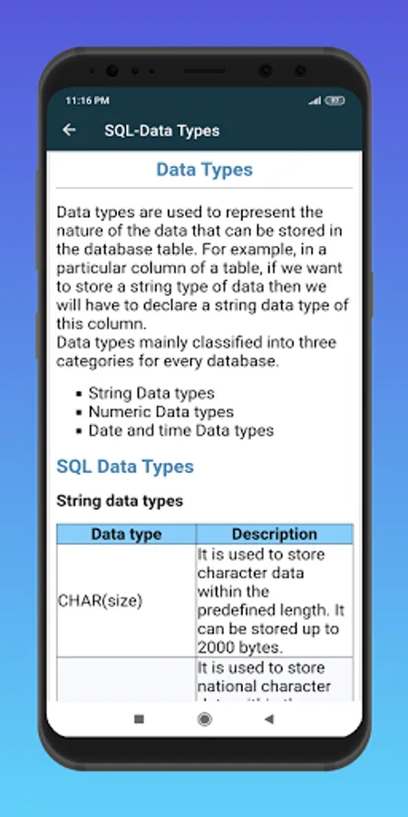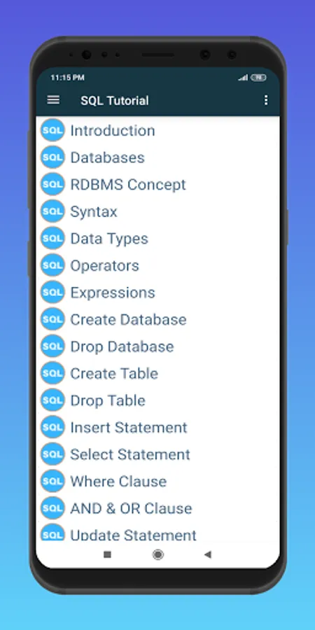 This App will help you to learn Basic and advance SQL topics. It can use developers or anyone who is interested in learning SQL from theory and implementation. If you are a programmer or a student you can use this App. This App is useful for beginners and professional who wants to learn SQL.