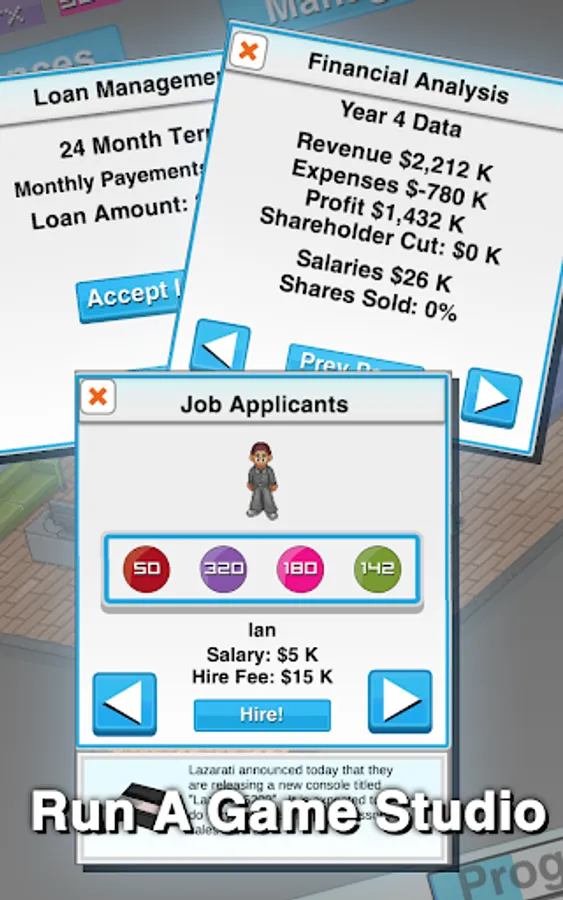 - Run a studio! This business isn't just about making games, it about staying afloat! Have total control of your company including how much investors should own of it.