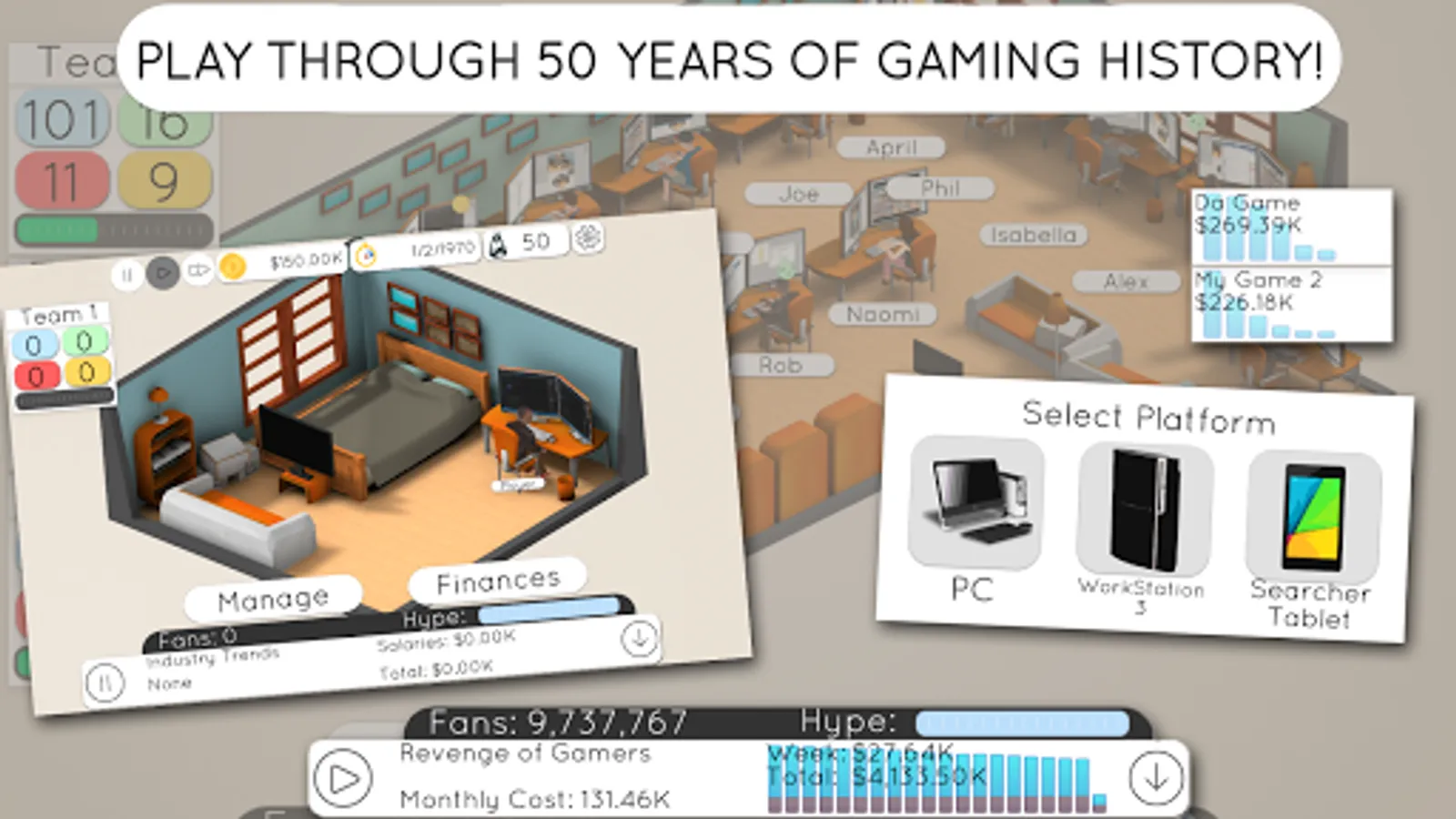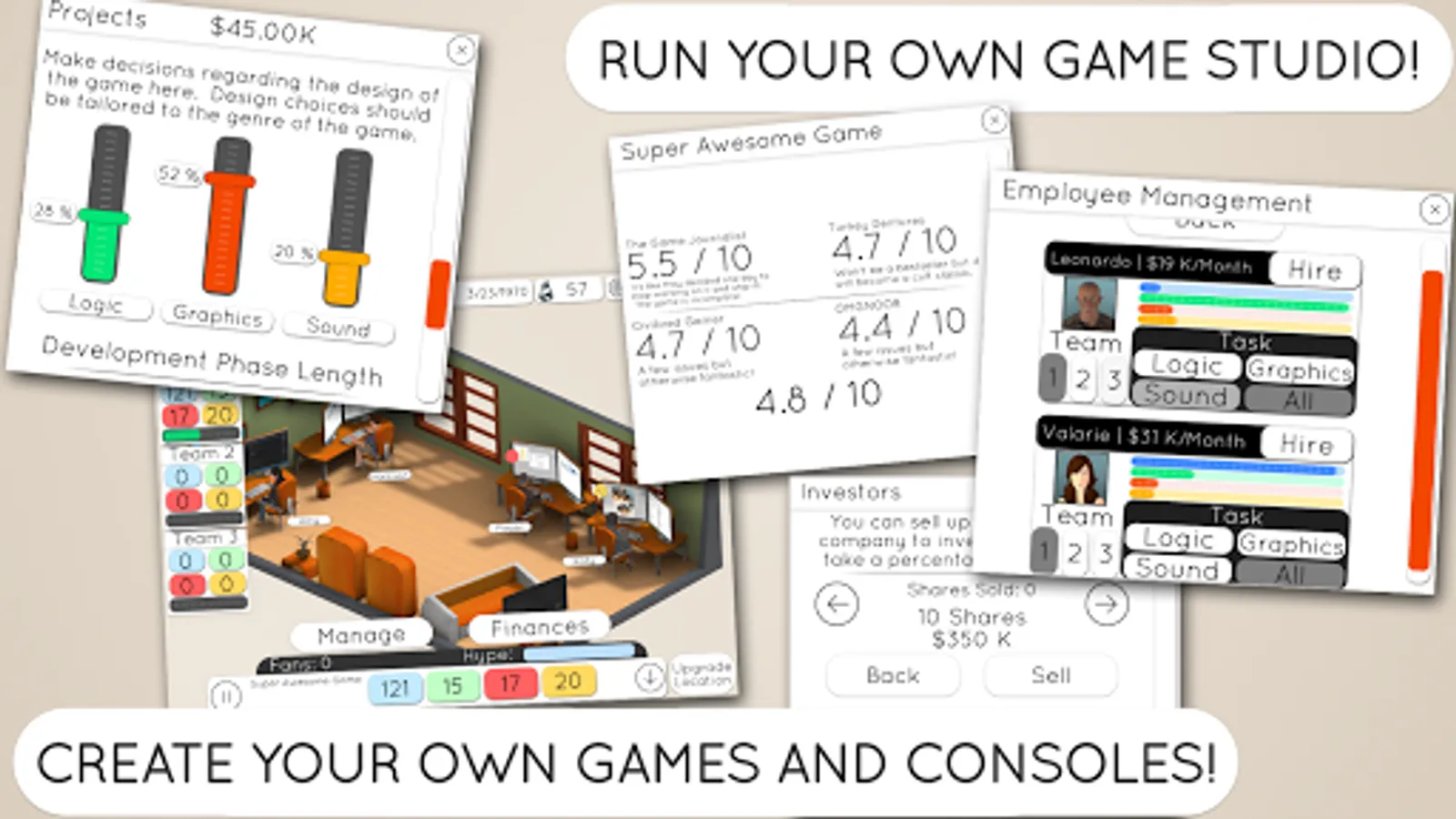 - Manage every detail of your studio! Hire employees, create up to 3 separate teams, raise money by getting investors and create games, consoles, and more!