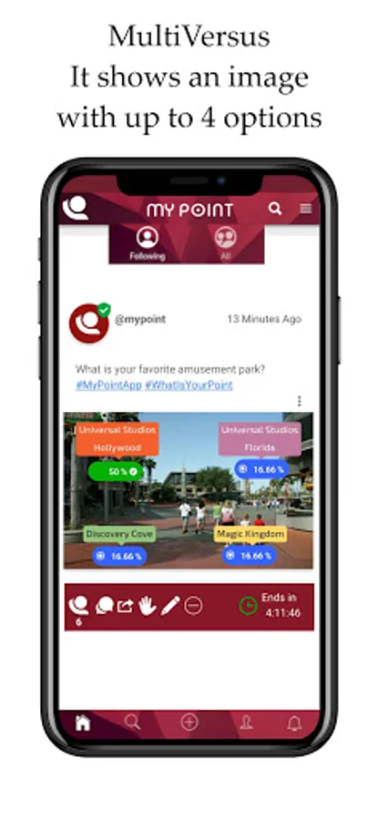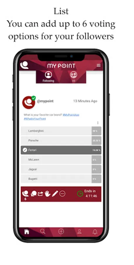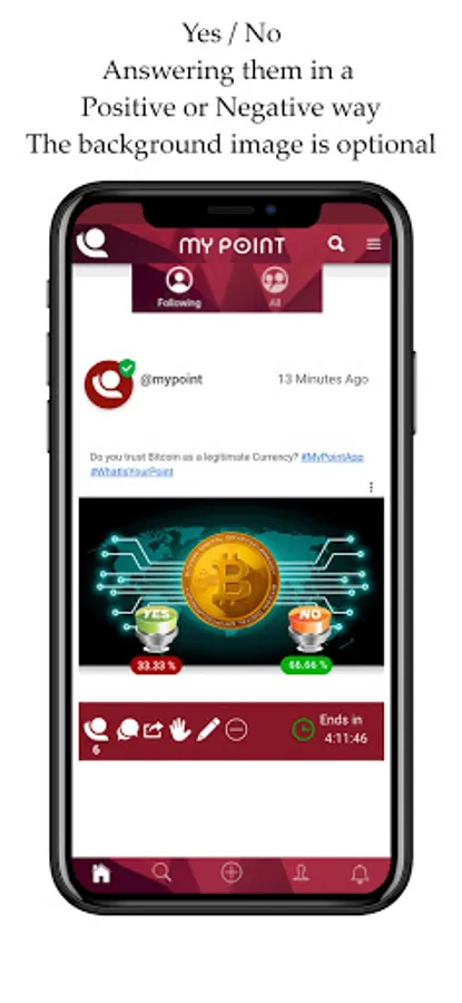 MyPoint is a mobile application that works as a social network where you can create Polls and consult their Followers on any topic such as: Sports, Cinema, Music, Beauty, Celebrities, Fashion, Politics, Culture, etc.