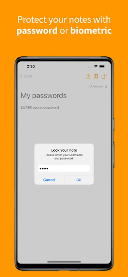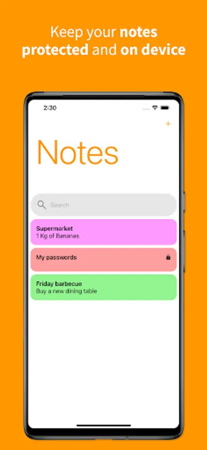 This app will allow you to keep your notes safe on your device without sharing information with external servers, all the data in your notes will be into your device all the times. You can add clear notes or you can protect them with passwords.