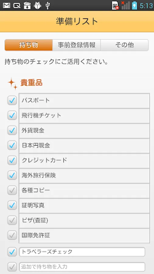 旅行の際に忘れ物をしがちな人でも、あらかじめ必要なものが書いてある「準備リスト」で必要な持ち物を確認していくだけで安心。もちろん、自分だけのカスタマイズした持ち物リストを作れば、次からの旅行もラクラクです。